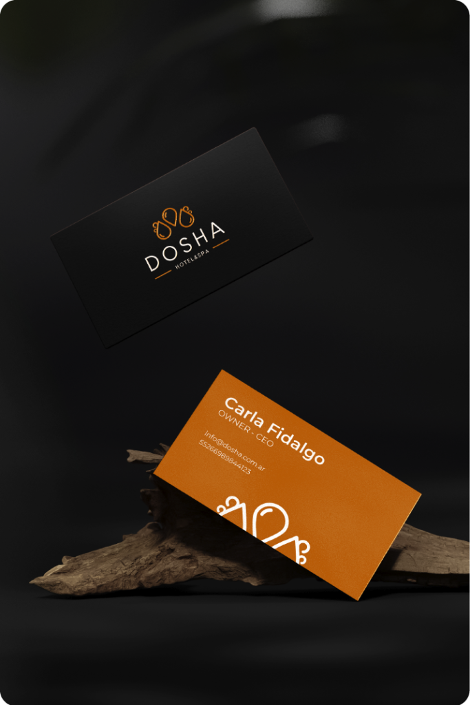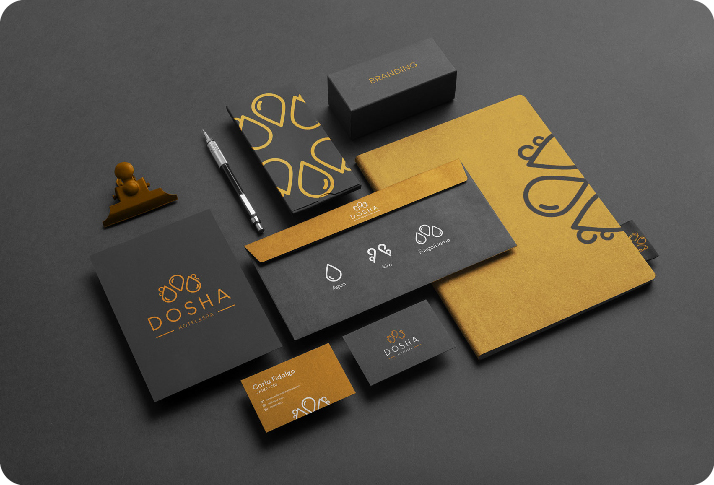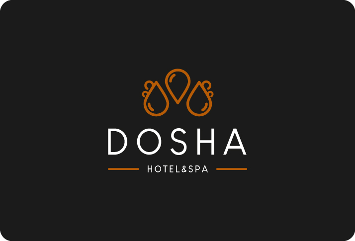 Los doshas son la energía interior que cada persona tiene, son 3 los tipos de doshas y cada uno lo representa un elemento. Aire, Agua y Fuego. Esta identidad se basó en la combinación de los tres formando un símbolo pregnante y lleno de vida. Se utilizaron colores tierra y dorados con fondos oscuros y negros representando la personalidad premium de este hotel, marcando la diferencia no sólo en estética sino también en concepto.