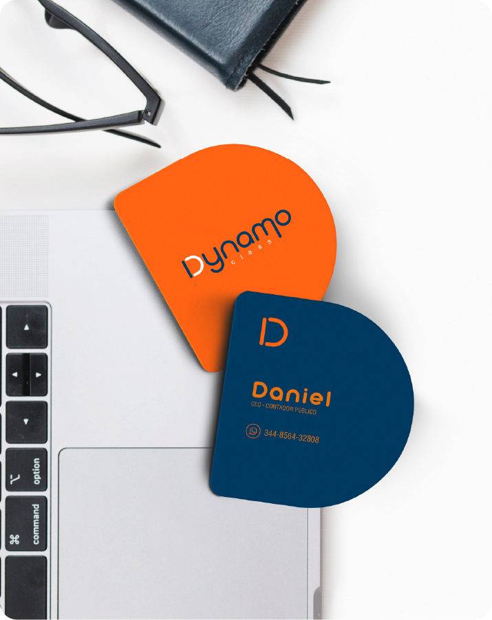 Dynamo es una plataforma online que brinda información, cursos y capacitaciones en contaduría. Está formada por diversos contadores, que asesoran a empresas y a la vez, a través de su plataforma, enseñan su profesión. Al ser una plataforma online, el símbolo y concepto principal se basó en la vista cenital de una computadora junto con medio círculo que forman los brazos de una persona utilizando el curso de contaduría en su PC. Esta combinación además forma una letra “D”, la iniciar de Dynamo.